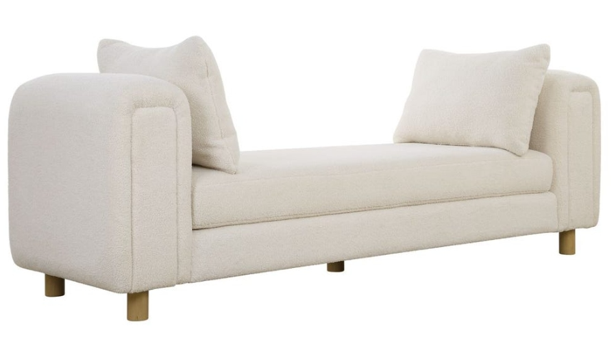 Exceptional comfort with dual functionality as an oversized bench or even a small day bed, featuring chunky curves and dowel feet in light oak, with two accent pillows. Upholstered in a finely textured faux sheepskin in soft ivory. Seat height is 17".Read More
